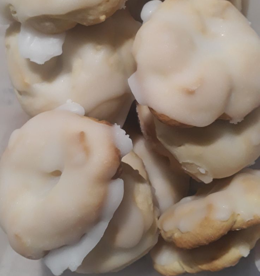 Far bollire insieme zucchero e acqua finchè si sciolgie lo zucchero. Versare a poco a poco in una ciotola parte della glassa mescolando finchè si addensa. Immergere uno per volta i biscotti nella glassa e poneteli su un vassoio a raffrerddare.